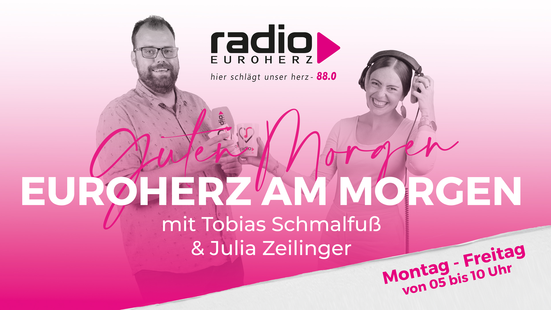 „Mit Hits und allen Infos aus der Euroherz-Region holen wir die Hörer aus dem Bett“, sagt Tobi. „Zudem haben wir alle 15 Minuten das zuverlässigste Wetter und den schnellsten Verkehrsservice.“